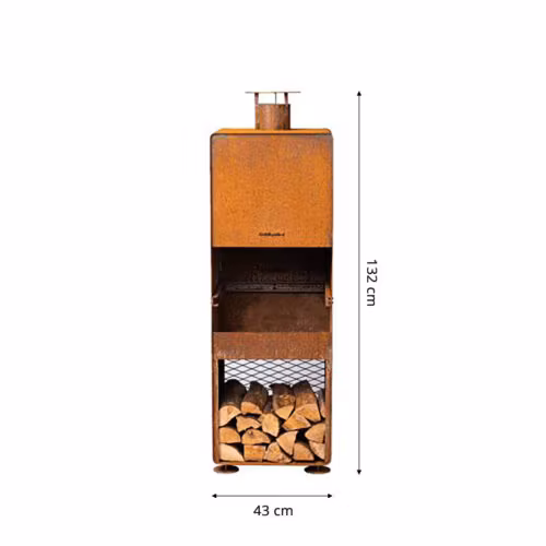 Enzo är en speciell utomhusspis. I skuggan av den blygsamma nordiska designen finns ett varmt italienskt hjärta. Tänd elden i den öppna spisen och varje sammankomst kommer att bli en speciell stund! Du kan även grilla i den öppna spisen, i setet ingår en grill i rostfritt stål. Utomhusspisen är gjord av väderbeständigt och högkvalitativt 3 mm cortenstål.